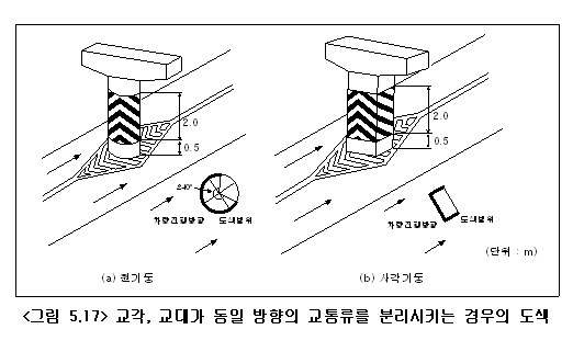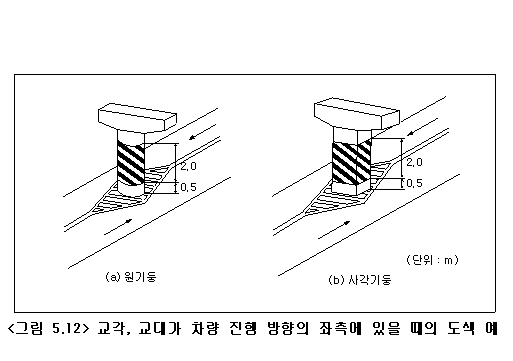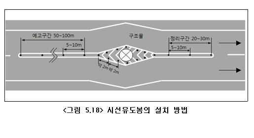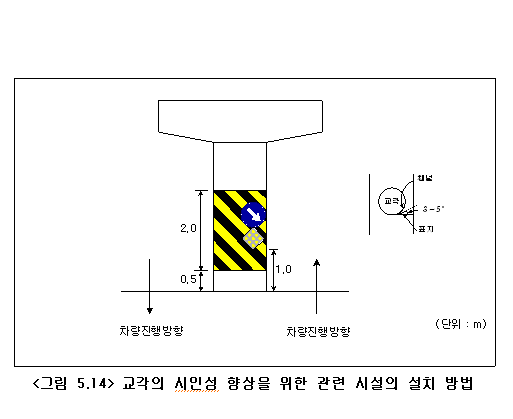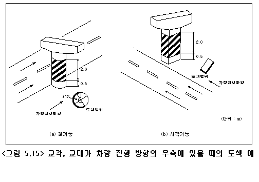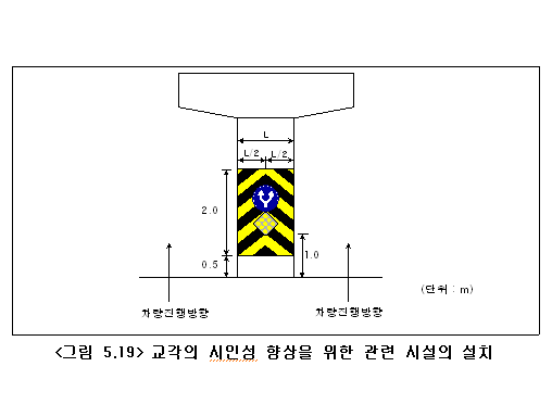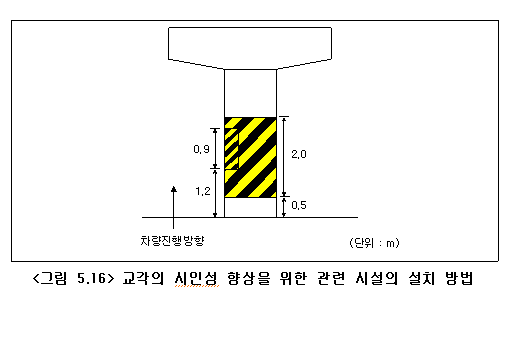 교각 및 교대에는 차량 진행 방향에 따라 적절한 빗금 방향이 되도록 도색을 실시하고, 교각 및 교대 주위에는 차량 충돌을 방지하기 위하여 시선유도봉으로 차량을 유도한다. 구조물의 시인성을 보다 높여야 하는 구간에서는 장애물 표적표지, 교통안전표지 등을 조합하여 설치한다.