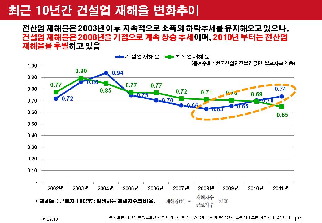 전산업 재해율은 2003년 이후 지속적으로 소폭의 하락추세를 유지해오고 있으나,