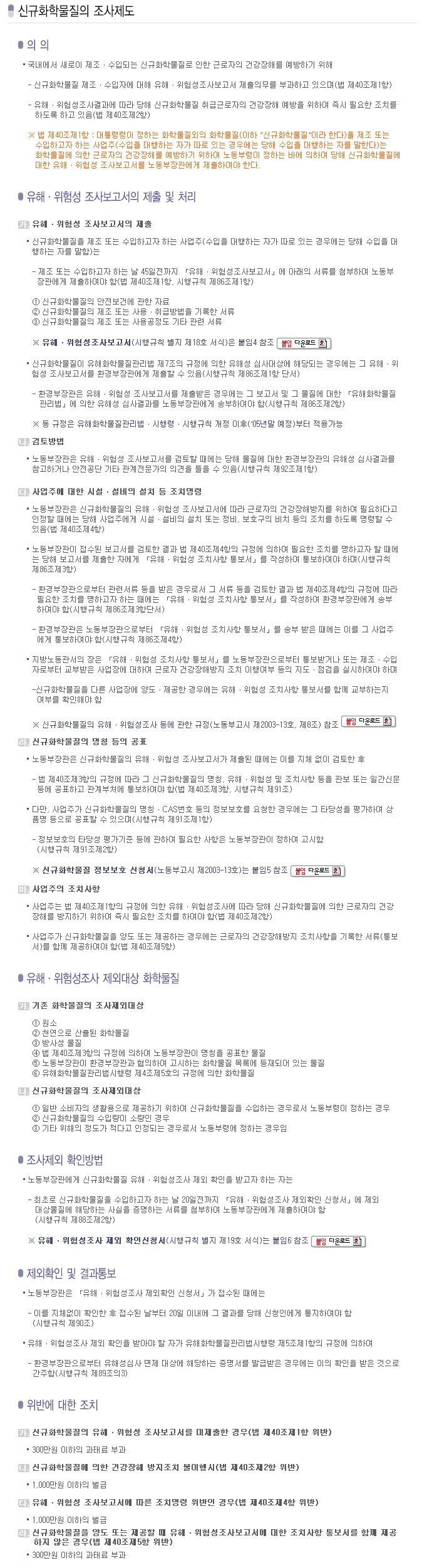 - 신규화학물질 제조ㆍ수입자에 대해 유해ㆍ위험성조사보고서 제출의무를 부과하고 있으며(법 제40조제1항)