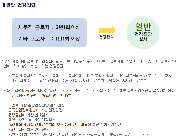 상시 사용하는 근로자의 건강관리를 위하여 사업주가 주기적(사무직 근로자는 : 2년에 1회 이상, 기타 근로자 : 1년에 1회 이상)으로 실시하는 건강진단