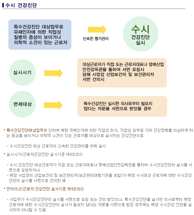 특수건강진단대상업무로 인하여 해당 유해인자에 의한 직업성 천식, 직업성 피부염 기타 건강장해를 의심하게 하는 증상을 보이거나 의학적 소견이 있는 근로자를 대상으로 실시하는 건강진단