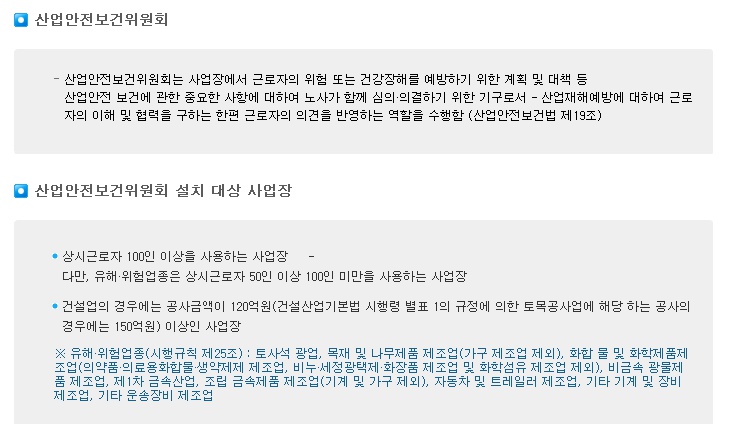 산업안전 보건에 관한 중요한 사항에 대하여 노사가 함께 심의·의결하기 위한 기구로서 - 산업재해예방에 대하여 근로자의 이해 및 협력을 구하는 한편 근로자의 의견을 반영하는 역할을 수행함 (산업안전보건법 제19조)