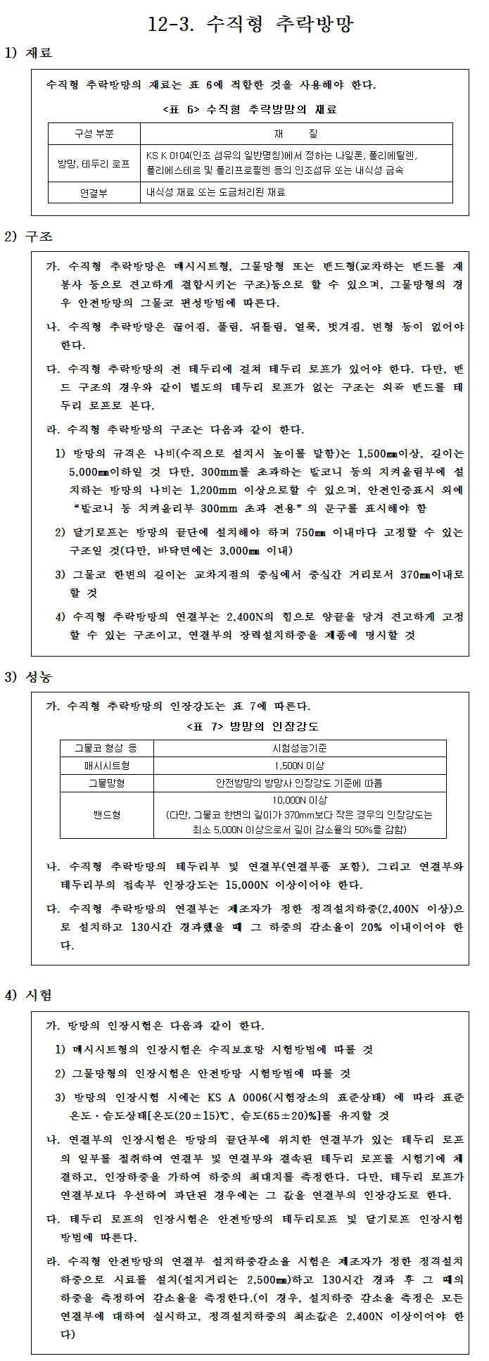 수직형추락방망 재료/구조/성능/시험기준