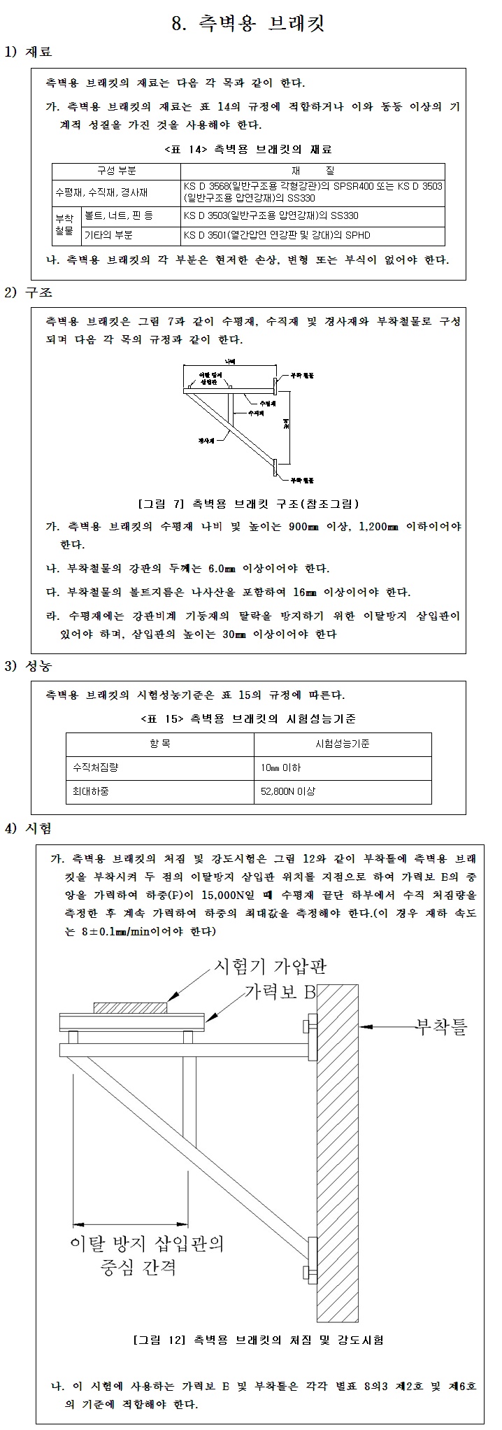 측벽용브라켓 재료/구조/성능/시험기준