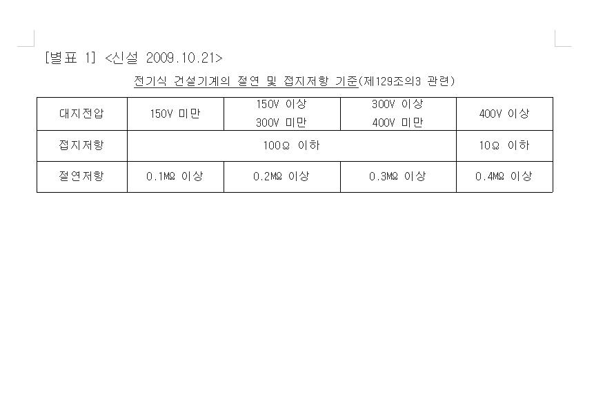 전기식 건설기계의 절연 및 접지저항 기준(제129조의3 관련)