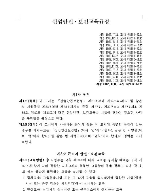 산업안전보건교육규정(고시제2012-63호, 2012.8.31)